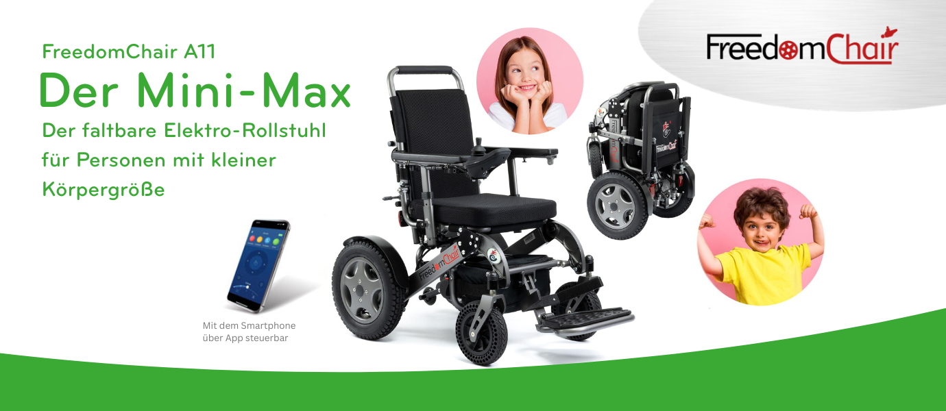Ein Elektro-Rollstuhl der nicht nur faltbar ist, sondern auch über das Smartphone steuerbar und in der Größe flexibel anpassbar ist? Klingt fast zu gut, um wahr zu sein, doch es gibt ihn nun tatsächlich: den FreedomChair A11 Mini-Max. Wie der Name schon vermuten lässt, bietet dieser Rollstuhl trotz seiner kleinen Abmessungen maximale Leistung. Hervorragend geeignet für Menschen mit kleinerer Körpergröße bis 150 cm, lässt sich das neueste FreedomChair Modell flexibel anpassen und kann so bei Kindern und Jugendlichen je nach Bedarf mitwachsen. Richtig smart ist die Steuerung über die App auf dem Smartphone, so kann die Lenkung individuell von Begleitpersonen übernommen werden und auch der Spaß kommt dabei nicht zu kurz.