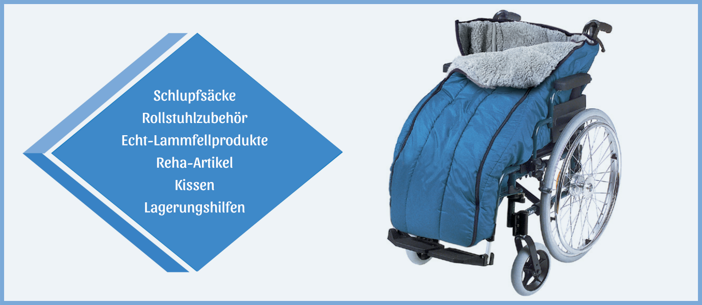 Unser umfangreiches Sortiment umfasst Schlupfsäcke, Rollstuhlzubehör, Echt-Lammfellprodukte, Reha-Artikel, Kissen und Lagerungshilfen. Viele Materialien, Modelle, Größen und Farben lassen sich individuell kombinieren – für bestmöglichen Komfort und Funktionalität.