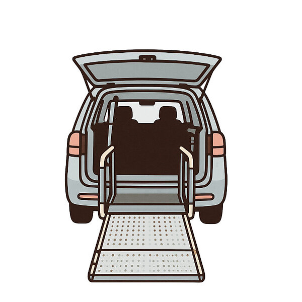 Rampe: Eine kostengünstige Lösung, die an der Seite oder Rückseite des Fahrzeugs angebracht wird. Der Rollstuhl wird entweder manuell oder elektrisch auf die Rampe gefahren.