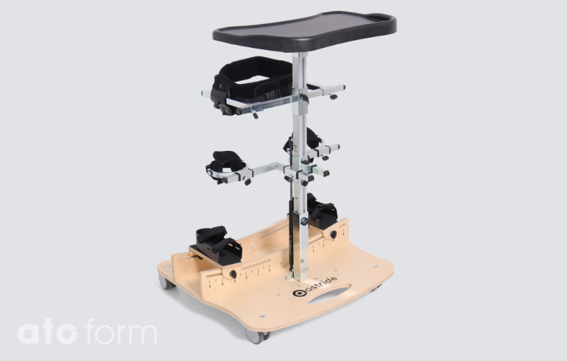 Astride ist ein statischer Stehständer mit Abduktionsfunktion. Er bietet vielseitige Einstellmöglichkeiten für Füße, Knie und Rumpf zur sicheren Positionierung des Kindes.