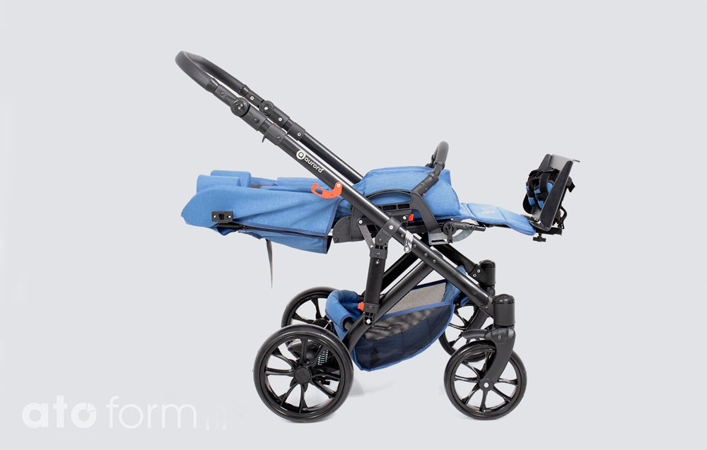 Der Rehabuggy von ATO FORM, der Aurora, ist ein modern gestalteter Kinderwagen, der speziell für Kinder mit besonderen Bedürfnissen entwickelt wurde. Er wurde insbesondere für kleine Nutzer mit Bewegungseinschränkungen konzipiert. Der größte Vorteil des Aurora liegt in seinem praktischen und vielseitigen umkehrbaren Sitz. Je nach Sitzposition kann das Kind entweder mit der Bezugsperson oder mit der Umgebung interagieren. Der Neigungswinkel der Sitzeinheit ist stufenlos einstellbar. Verstellbare Beinführungen und Seitenpolster bieten optimale Körperstabilisierung. Zudem können die Höhe der Kopfstütze, der Winkel der Rückenlehne sowie die Höhe und der Neigungswinkel der Fußstütze individuell angepasst werden. Dadurch kann der Rehabuggy auf die spezifischen Bedürfnisse von Kindern unterschiedlichen Alters und Entwicklungsstandes angepasst werden. Der Aurora ist mit variablen Stoßdämpfern (weich oder hart) ausgestattet, und die schwenkbaren Vorderräder lassen sich bei Bedarf blockieren. Der Rehabuggy wird mit einem verstellbaren und faltbaren Schutzdach, einem Fußsack, einem geräumigen Ablagekorb unterhalb des Sitzes und einer praktischen Tasche geliefert.