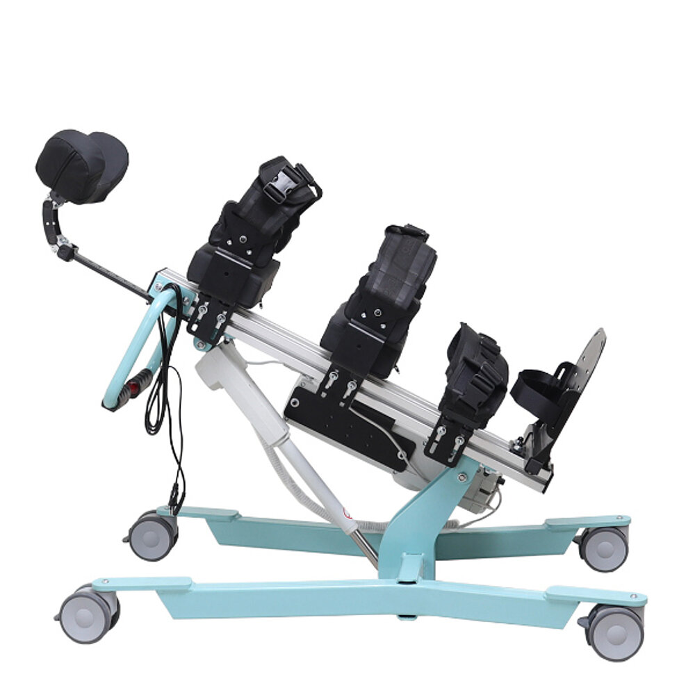 Der Multi-Position-Kipptisch ermöglicht die Einstellung der Nutzerposition von horizontal bis vertikal. Es handelt sich um ein Modell für die Rückenlage. Die Steuerung erfolgt elektrisch oder pneumatisch.
