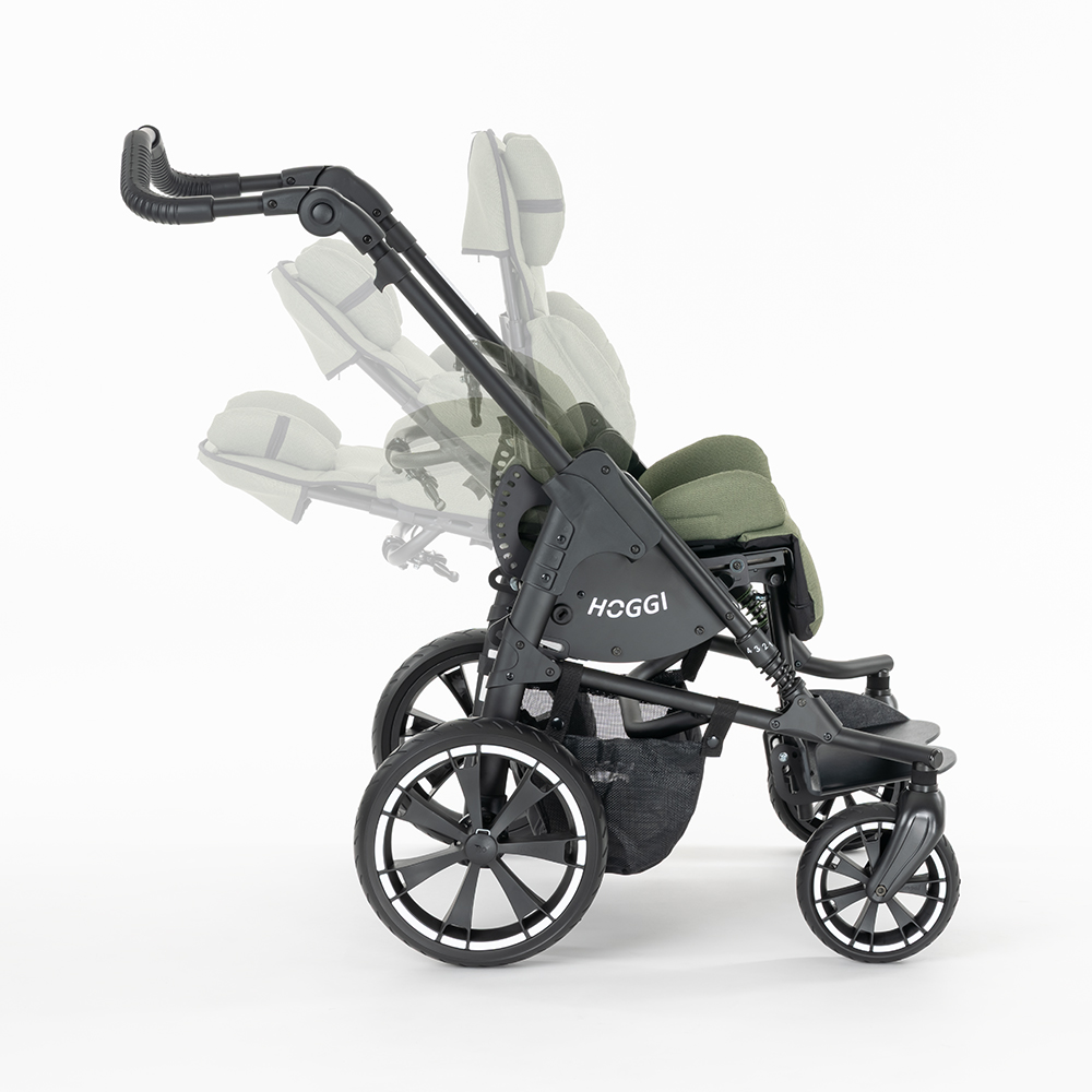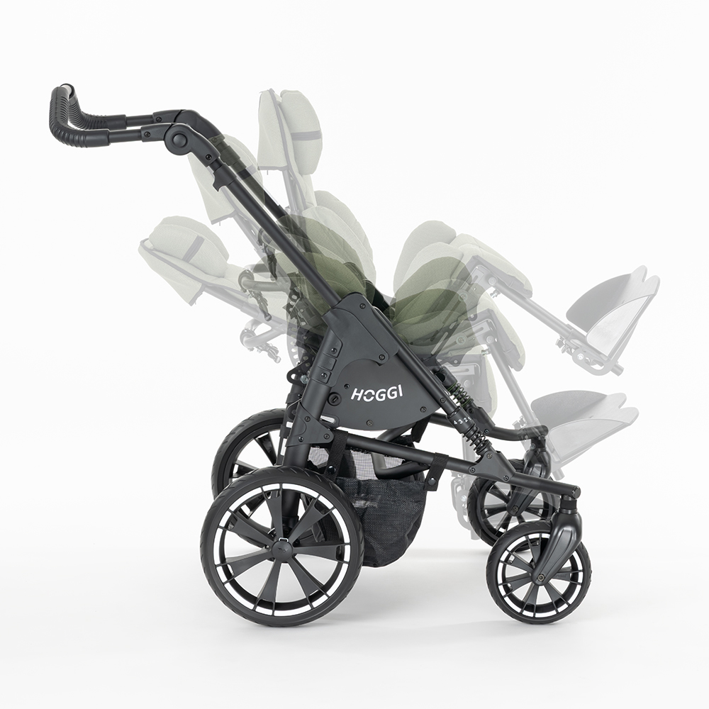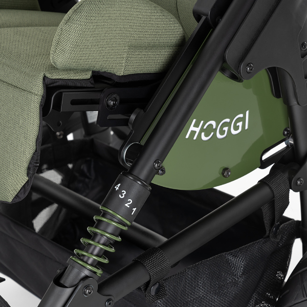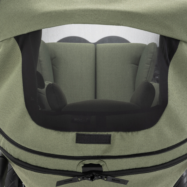 Die Kombination aus matt schwarzem Rahmen und schilfgrünem Polster wird homogen durch ein neues, hochwertiges Verdeck (mit UV-Schutz 50+, Luftzirkulation und großem Sichtfenster) in Polsterfarbe ergänzt.