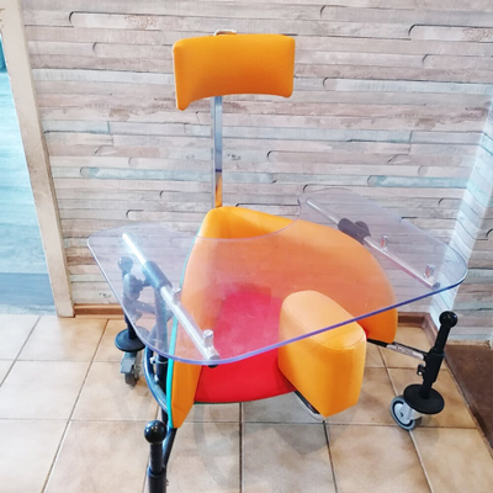 Unser Birillo ist mit einer Kopfstütze ausgestattet und bietet die Möglichkeit, statt des Bauchbügels einen transparenten Tisch aufzustecken. Da unsere Tochter rumofhypoton ist, hat sie zusätzlich noch ein Rückenpolster und einen Brustgurt nachgerüstet bekommen.