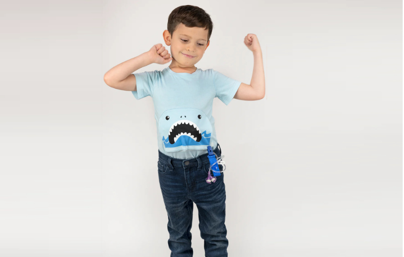 Body für Kinder mit Behinderung mit Reißverschlussöffnung am vorderen Bauch, um Zugang zu Ernährungssonden, Stoma und mehr zu erhalten.