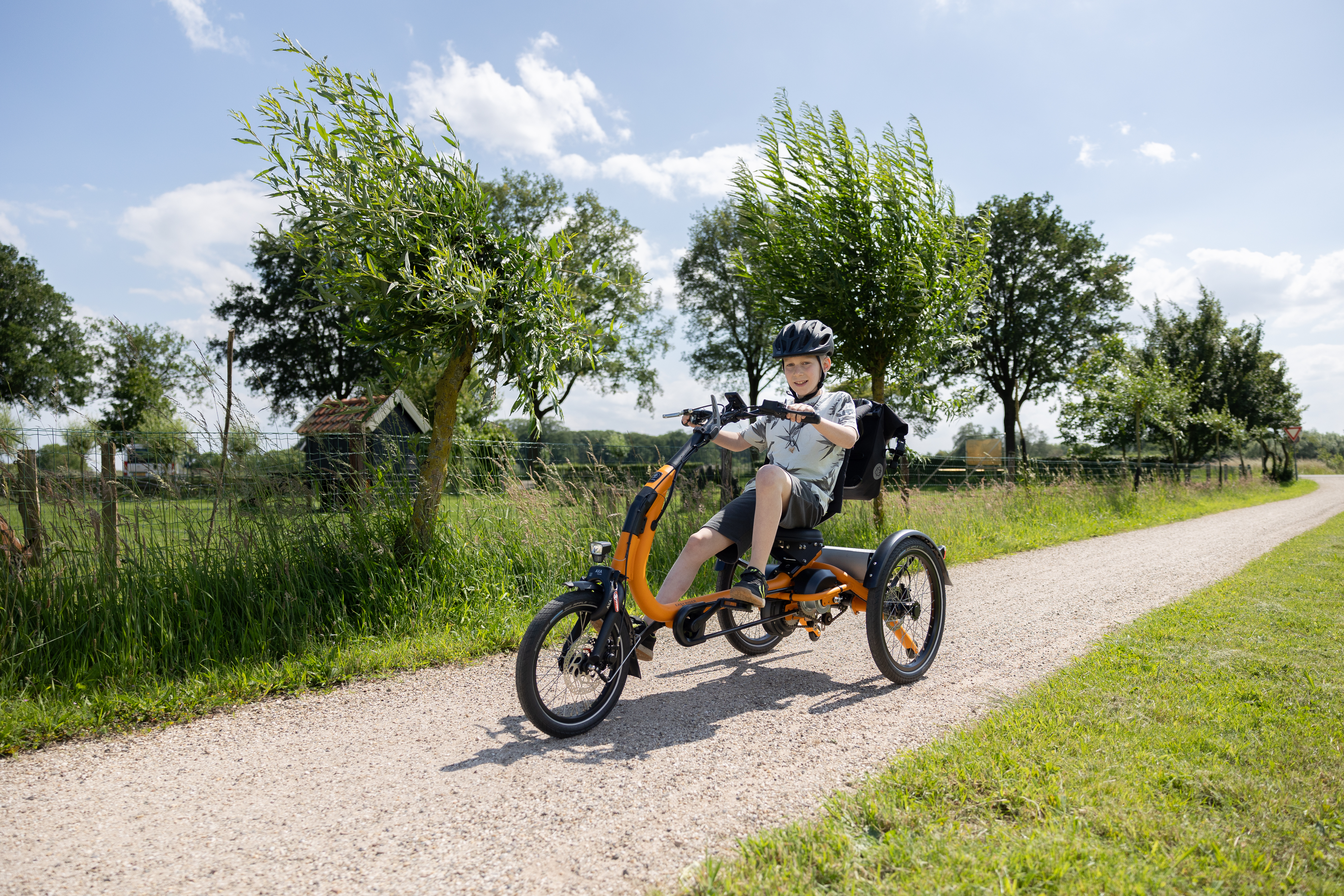 Das Easy Rider Compact Small ist ein komfortables Dreirad speziell für Kinder, die zusätzliche Stabilität benötigen. Mit Tiefeinstieg, Sesselfläche und Rückenlehne bietet es mehr Unterstützung als ein herkömmliches Fahrrad. Die nach vorne gerichtete Tretbewegung verleiht dem Rad einen sportlichen Charakter. Optional sind Richtungsanzeiger, Armlehnen, Fußfixierung und elektrische Tretunterstützung erhältlich. Mit Smart E-Bike Funktion kann die vanRaam App verwendet werden, um verschiedene Unterstützungsprogramme einzustellen. Aus Sicherheitsgründen ist die Höchstgeschwindigkeit auf 15 km/h begrenzt.