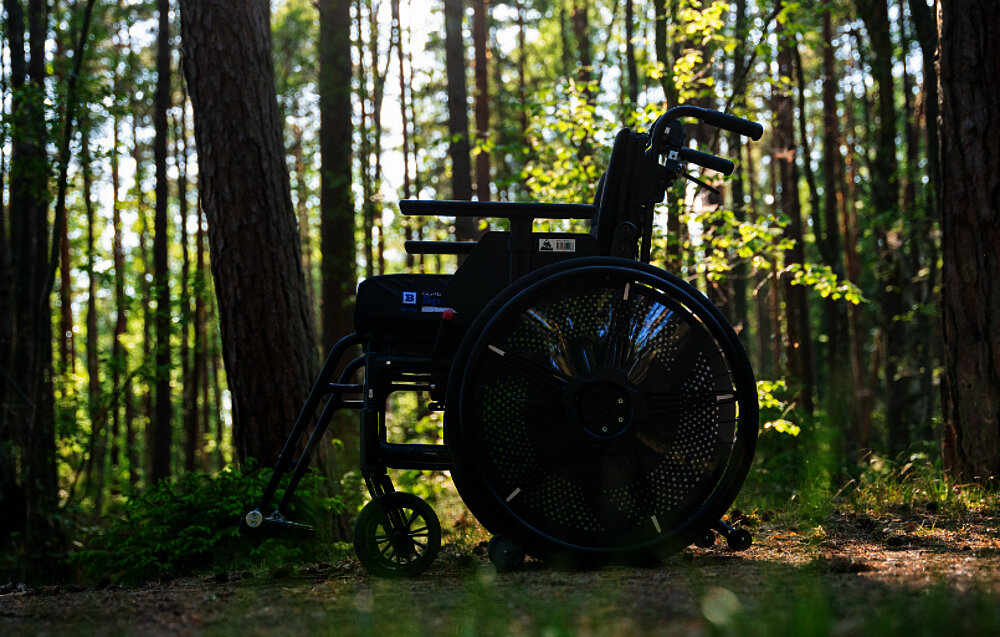 Easy Wheel ist ein mechanisches Antriebssystem für manuelle Rollstühle, das bis zu 50 % der erforderlichen Kraft für die Fortbewegung erzeugt. Es ermöglicht Rollstuhlfahrern, sich trotz Schmerzen und eingeschränkter Kraft selbstständig zu bewegen. Dank des Nabenantriebs wird die Bewegung in Kraft umgewandelt, und der Greifreifen legt die doppelte Strecke des Rads zurück, wodurch der erforderliche Aufwand halbiert wird.