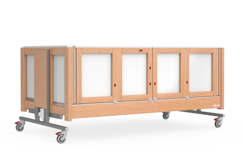Der umlaufende Rundumschutz von 60 cm mit einer fest integrierten, 6 cm starken Abpolsterung schützt zuverlässig bei unwillkürlichen Bewegungen, ohne das Innenmaß einzuschränken. Die viergeteilte Liegefläche, vollständig zu öffnende Seitentüren und eine Höhenverstellung von bis zu 50 cm ermöglichen eine optimale Lagerung und erleichtern die tägliche Pflege – immer mit dem Ziel, Sicherheit und Lebensqualität bestmöglich zu verbinden.