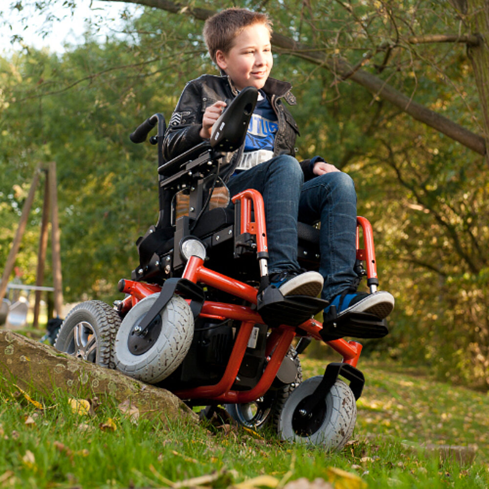 Der Forest Kids ist ein Elektrorollstuhl speziell für Kinder, der sowohl für den Innen- als auch für den Außenbereich geeignet ist. Er wurde entwickelt, um Hindernisse mühelos zu überwinden und bietet dank seiner 4 Räder stets Bodenkontakt, selbst auf unebenen Oberflächen mit bis zu 120 mm Höhenunterschied. Der Rollstuhl verfügt über höhenverstellbare Schiebegriffe, Armlehnen, die in der Höhe angepasst werden können, sowie Beinauflagen, die sich in der Tiefe verstellen lassen. Zusätzlich sind LED-Leuchten vorne und hinten integriert, und eine spezielle Stabilitätsachse sorgt dafür, dass alle 4 Räder sicher auf dem Boden bleiben.