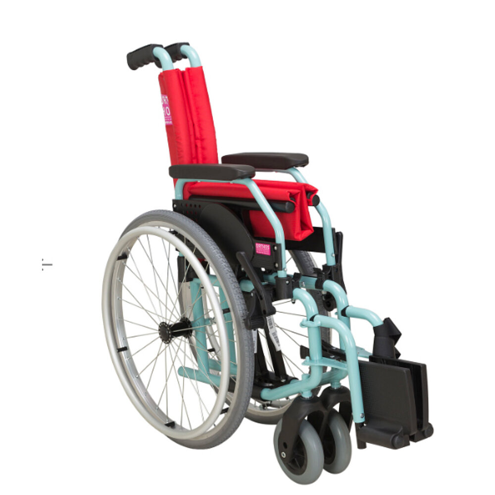 Zur Wahl stehen entweder 550 mm große Hinterräder (wahlweise massiv oder luftbereift) in Kombination mit 150 mm großen Vorderrädern aus Vollgummi. Zusätzlich ist ein Transit-Modell mit 300 mm Hinterrädern erhältlich, ideal für Kinder, die den Rollstuhl nicht eigenständig antreiben können. Der Rollstuhl ist für ein maximales Benutzergewicht von 125 kg ausgelegt und eignet sich hervorragend für Kinder mit eingeschränkter Mobilität.