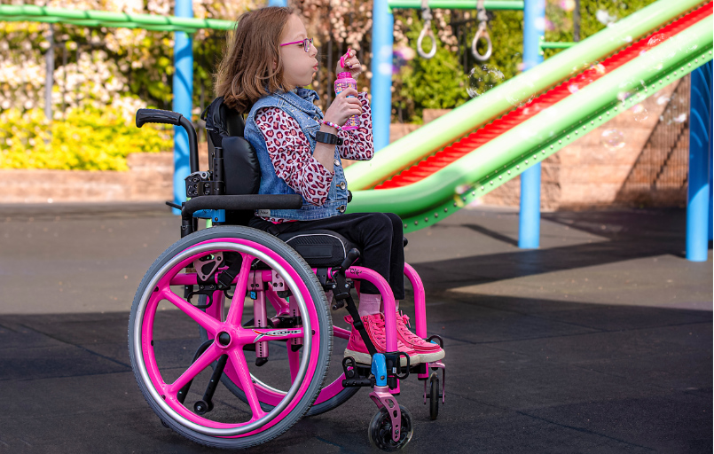 Ein pädiatrischer Adaptivrollstuhl mit einem robusten, pulverbeschichteten Aluminiumrahmen. Er verfügt über eine Rückenlehne mit Schiebegriffen, abnehmbare Antriebsräder mit Greifreifen hinten, frei mitlaufende Lenkräder vorn und eine textile Sitz- und Rückenbespannung. Der Rollstuhl bietet austauschbare Armstützen, ein durchgehendes Fußbrett sowie optional winkelverstellbare Fußrasten. Die Positionierung der Sitzeinheit ist unabhängig von den Fahrwerkseinstellungen und die horizontale Antriebsradposition kann angepasst werden.