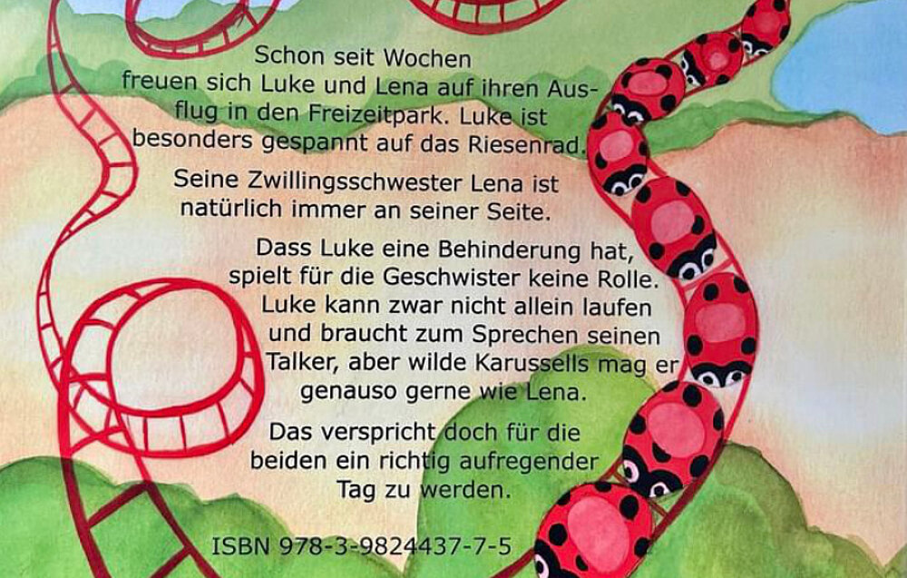 Schon seit Wochen freuen sich Luke und Lena auf ihren Ausflug in den Freizeitpark. Luke ist besonders gespannt auf das Riesenrad. Seine Zwillingsschwester Lena ist natürlich immer an seiner Seite. Dass Luke eine Behinderung hat, spielt für die Geschwister keine Rolle. Luke kann zwar nicht allein laufen und braucht zum sprechen seinen Talker, aber wilde Karussells mag er genauso gern wie Lena. Das verspricht doch für die beiden ein richtig aufregender Tag zu werden.