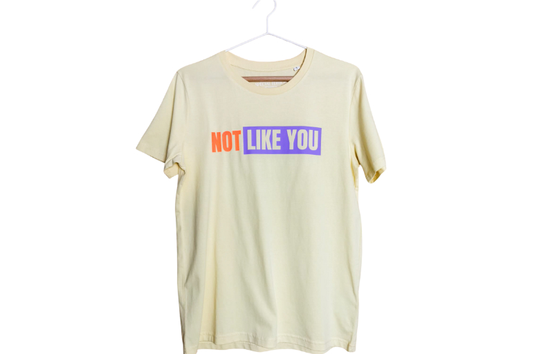 - Unisex Shirt in frischem pastell gelb mit Aufdruck in lila und neon orange