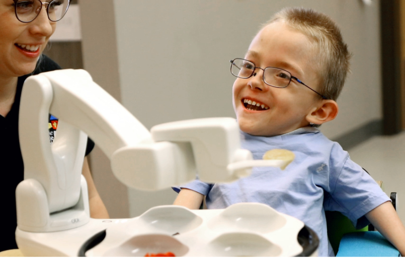 Obi ist ein revolutionäres Hilfsmittel für die Nahrungsaufnahme, das Menschen mit eingeschränkter oder fehlender Beweglichkeit der oberen Gliedmaßen ein angenehmes und würdevolles Esserlebnis ermöglicht. Durch die Benutzerkontrolle über Auswahl der Speisen und Essgeschwindigkeit werden Mahlzeiten wieder zu einem Vergnügen, nicht zu einer lästigen Pflicht. Obi ist benutzerfreundlich, tragbar und ideal für Zuhause oder unterwegs, zum Beispiel im Restaurant. Nach einem einfachen Lernprozess sind die vier Schalen für verschiedene Mahlzeiten bereit. Das moderne Design und die lebensechte Bewegung haben eine positive Wirkung auf Benutzer, Familien, Freunde und Betreuer. Obi zeichnet sich durch seine subtile Persönlichkeit aus und ist leicht zu reinigen. Er ist in Sekundenschnelle einsatzbereit, verfügt über Kollisionserkennung für Benutzersicherheit und ist tragbar.