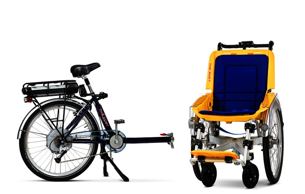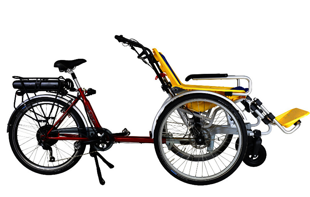 Das Rollfiets Duet ist eine clevere Kombination aus Fahrrad und Rollstuhl. Während einer fährt, kann der andere bequem im Rollstuhl vorne Platz nehmen. Bei Ankunft am Ziel können Sie den Rollstuhl abnehmen, und er wird zu einem eigenständigen, leicht zu bedienenden Rollstuhl.