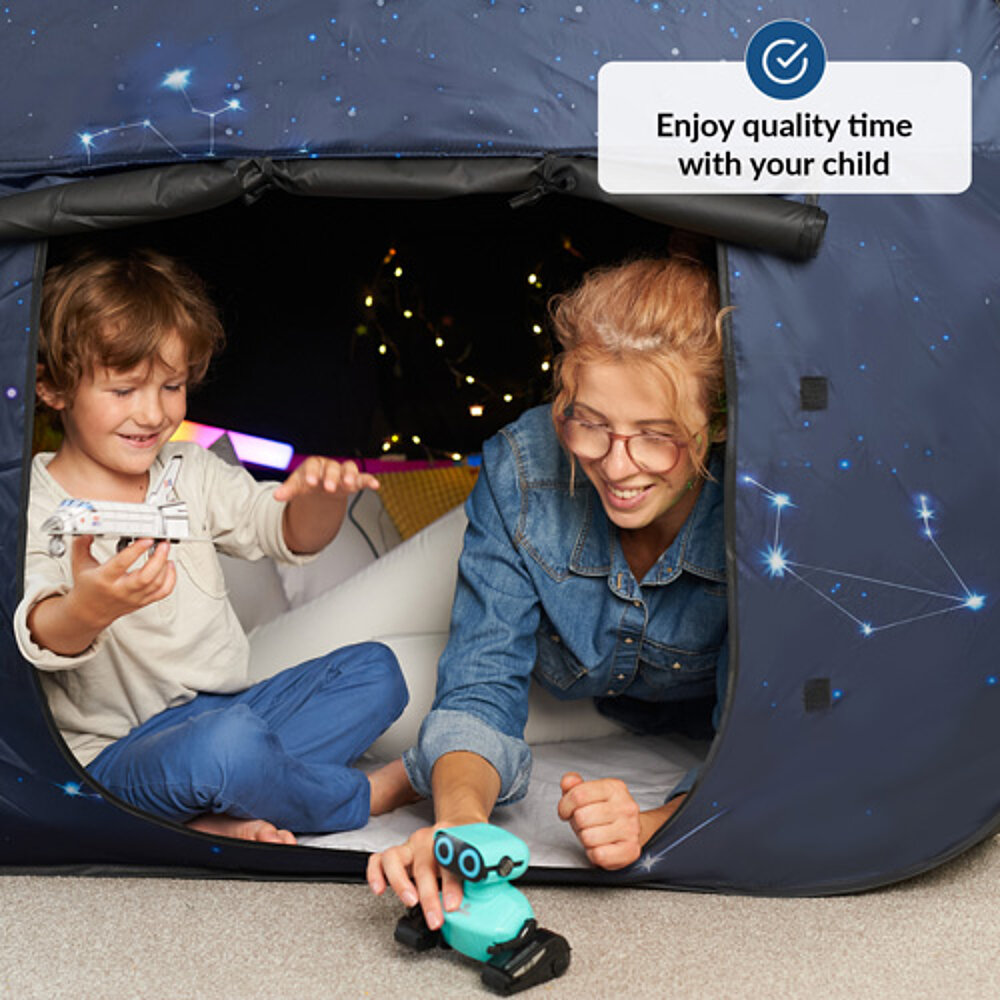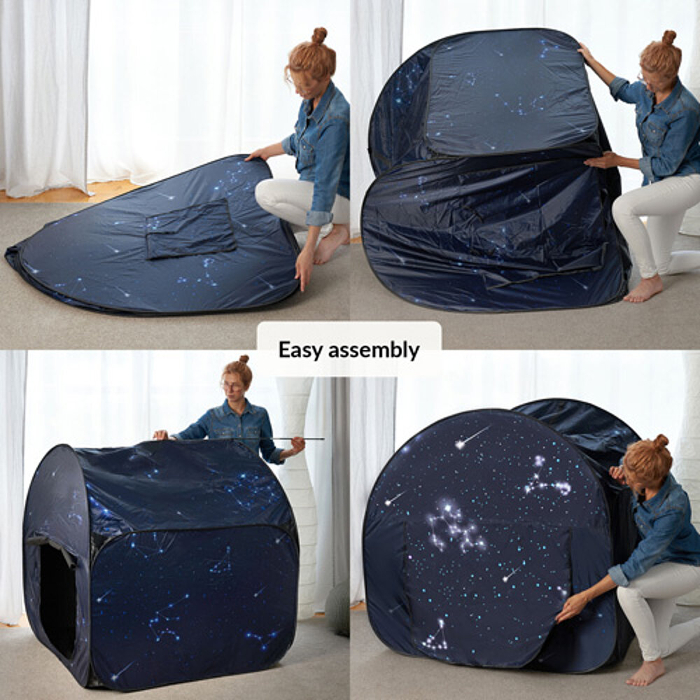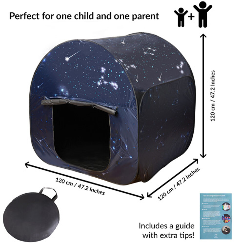 Sensorische Ecke für Kinder: Ein ruhiger Raum im Raum, ideal zum Spielen und Entspannen. Das Zelt bietet eine sichere Umgebung für Kinder mit besonderen Bedürfnissen wie SPD, Autismus oder Konzentrationsproblemen. Mit seinem Verdunkelungseffekt eignet es sich auch für Lichtspiele und schafft einen eigenen Raum für die Sinne. Schnell aufzubauen und tragbar, perfekt für zu Hause oder in der Schule, wenn ein separater Rückzugsort fehlt.