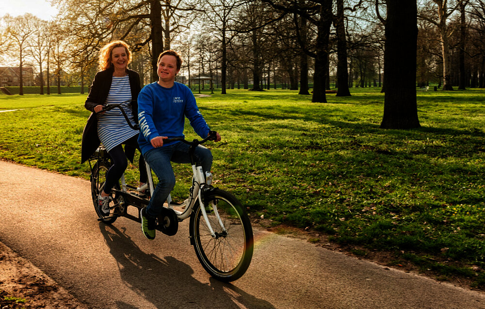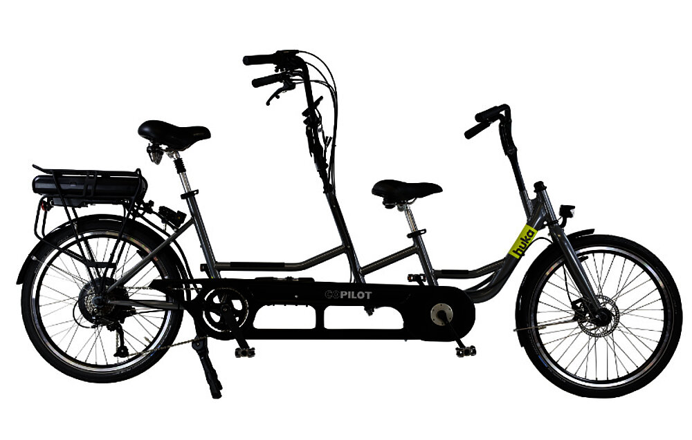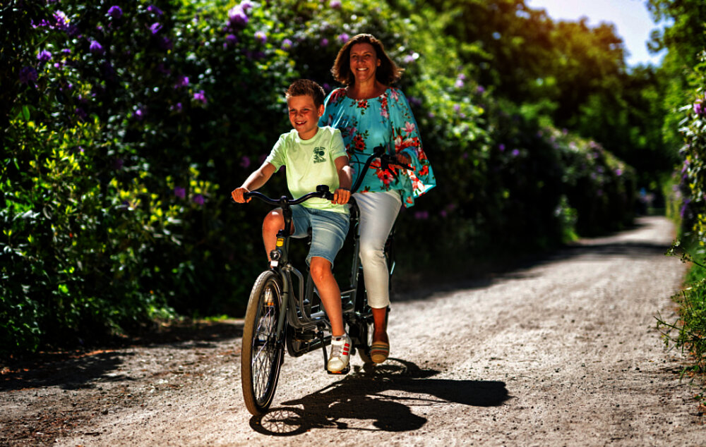Dank des dritten Rads können beide Fahrende bequem sitzen, auch im Stillstand. Auf- und Absteigen gestaltet sich einfach aufgrund der hohen Stabilität. Der vordere Teil kann für mehr Platz beim Auf- und Absteigen heruntergeklappt werden. Der Begleiter übernimmt die Lenkung, während der Beifahrer einen Lenker zum Festhalten hat. Der Begleiter entscheidet über den zuschaltbaren Freilauf, der es dem Beifahrer ermöglicht, in die Pedale zu treten. Durch den regulären Freilauf kann der Beifahrer wählen, ob er mittritt. Ein Tandem, das gemeinsames Radfahren ohne Sicherheitsbedenken ermöglicht.