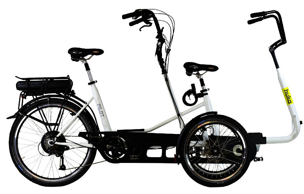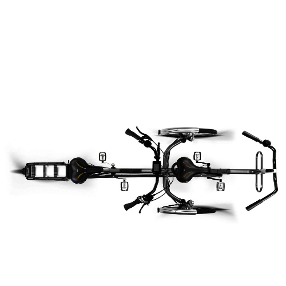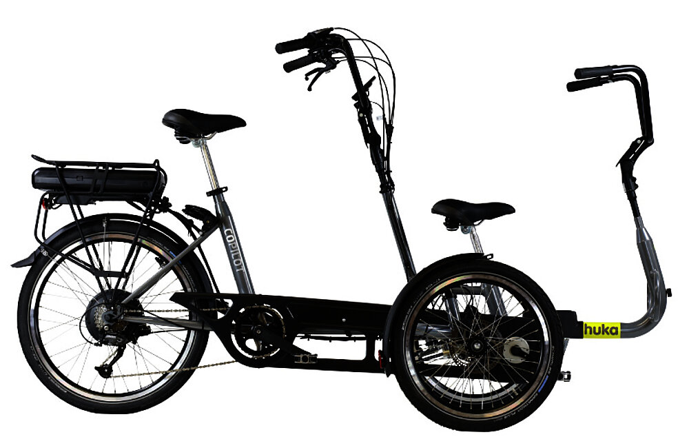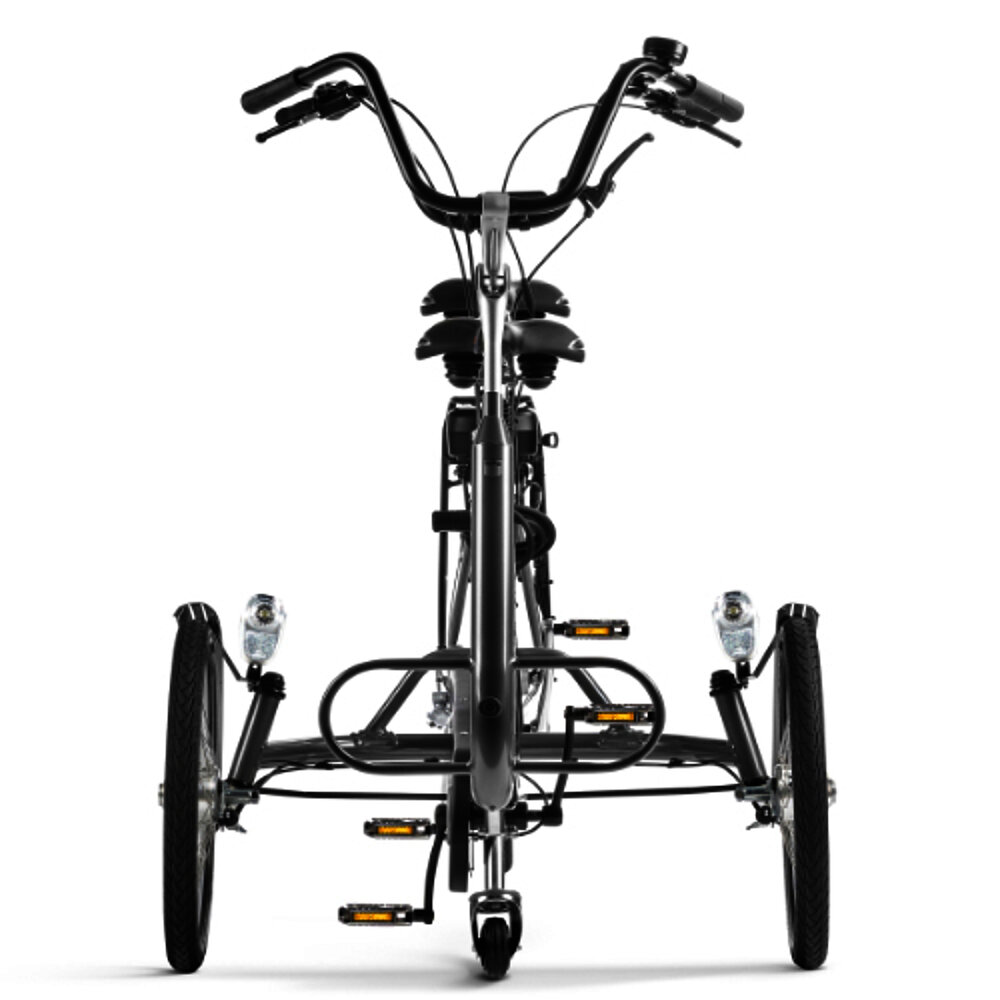 Dank des dritten Rads können beide Fahrende bequem sitzen, auch im Stillstand. Auf- und Absteigen gestaltet sich einfach aufgrund der hohen Stabilität. Der vordere Teil kann für mehr Platz beim Auf- und Absteigen heruntergeklappt werden. Der Begleiter übernimmt die Lenkung, während der Beifahrer einen Lenker zum Festhalten hat. Der Begleiter entscheidet über den zuschaltbaren Freilauf, der es dem Beifahrer ermöglicht, in die Pedale zu treten. Durch den regulären Freilauf kann der Beifahrer wählen, ob er mittritt. Ein Tandem, das gemeinsames Radfahren ohne Sicherheitsbedenken ermöglicht.