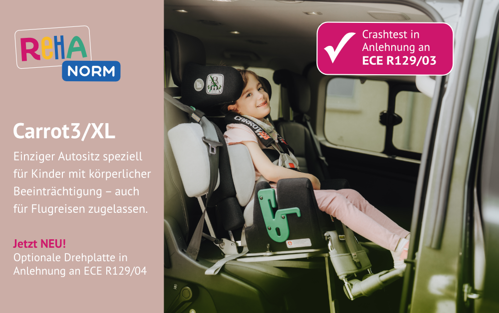 Wir hatten zuerst einen Reha-Autositz von Anatomic Sitt, dann einen Carrot, aber aufgrund der Spastik und der starken Lordose war das Sitzen in diesen Sitzen nicht optimal. Deshalb haben wir den Transport auf den Rollstuhl umgestellt, da das Umsetzen in den Autositz zu schwierig wurde. Mit dem Rollstuhl ist der Aufwand für die täglichen Fahrten zur Therapie deutlich erleichtert worden. Wir haben einen Rollstuhlumbau im VW Caddy und nutzen den Rollstuhl Tilty von Sorg mit einer Sitzschale von Anatomic Sitt.