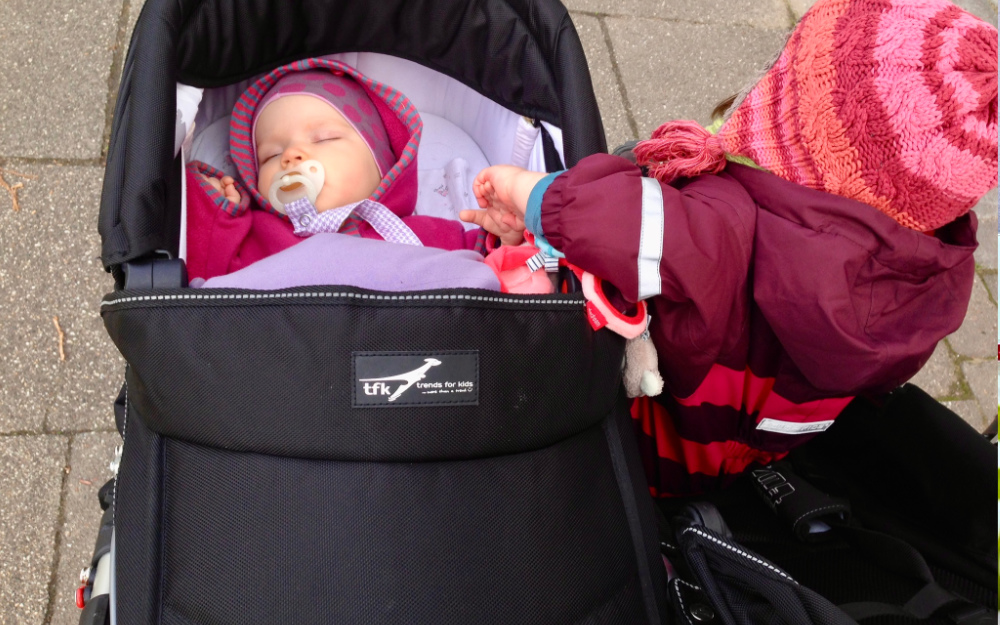Das Baby zunächst in die Trage, ein Geschwisterwagen für längere Spaziergänge. Bei hypotonen Kindern kann der Goto zb. auch in den Geschwisterwagen gesetzt werden.