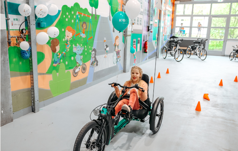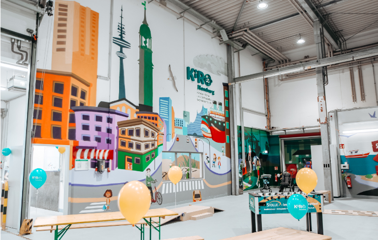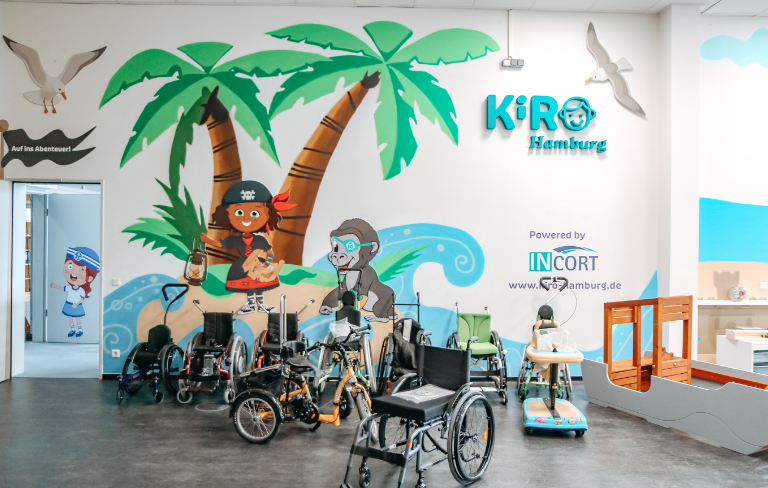 Die Kids brauchen eine Umgebung, in der sie sich wohlfühlen und die ihnen Raum lässt, sich zurechtzufinden. Aus diesen Anforderungen ist in einer ehemaligen Lagerhalle im Gewerbegebiet Neuland das einzigartige Kinder-Orthopädie- und Rehatechnikzentrum KiRO Hamburg entstanden. In einer künstlerisch-bunten maritimen Umgebung können die Kids ihre Orthopädie- und Rehatechnik an- und gleich ausprobieren. Ein Indoor-Parcour mit Wegeführung und unterschiedlichen Bodenbelägen steht für Testfahrten zur Verfügung. Die Werkstatt ist direkt vor Ort, so dass die Technik individuell angepasst und eingestellt wird.